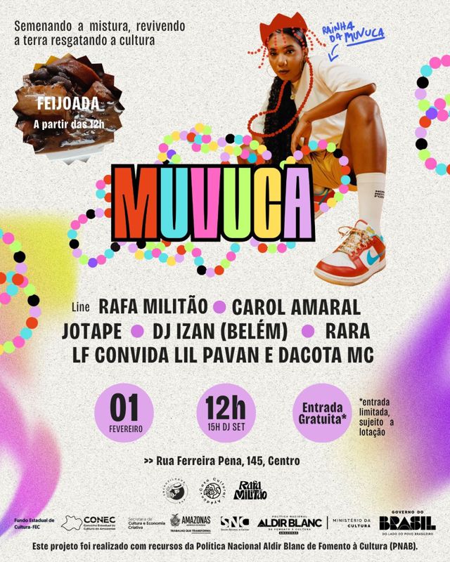 A Casa Cultural Ayédùn e a DJ Rafa Militão realizam, neste domingo, 1º de fevereiro, a 4ª edição do Muvuca, em uma temática especial de Carnaval. O evento acontece no Encruzilhada Bar, no Centro de Manaus, com entrada gratuita, sujeita à lotação do espaço. A programação inicia a partir das 12h, com feijoada, e segue com apresentações musicais a partir das 15h.
